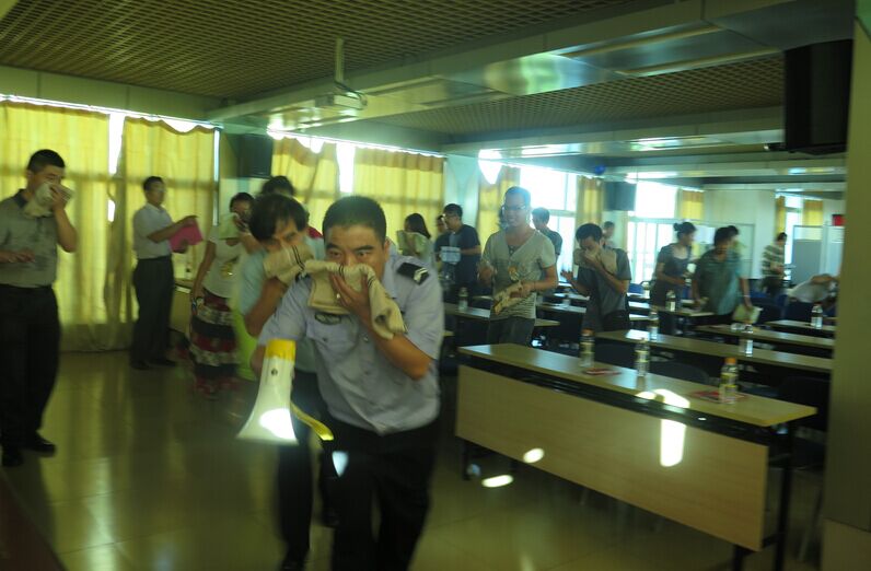 講座結(jié)束后,參訓(xùn)人員在工作人員的統(tǒng)一指揮下,進(jìn)行應(yīng)急疏散逃生演練。大家在引導(dǎo)員的指導(dǎo)下口捂毛巾,井然有序地彎腰從會(huì)議室向指定疏散點(diǎn)集合,并以比賽的形式進(jìn)行實(shí)地滅火演練。